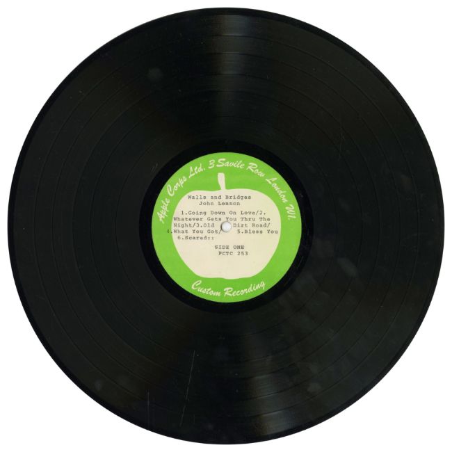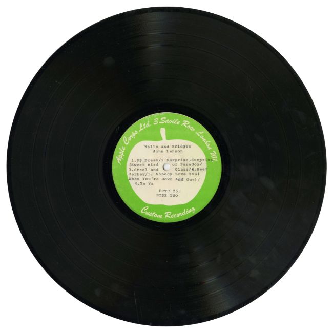 A double sided 12 inch Apple Corps Ltd. 3 Savile Row custom recording test pressing for John Lennon's 1974 LP entitled ‘Walls And Bridges’. The test pressing is on the Apple Corps Ltd Custom Recording label with typed detail and track listings on each side.