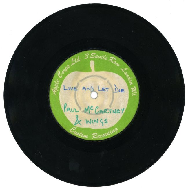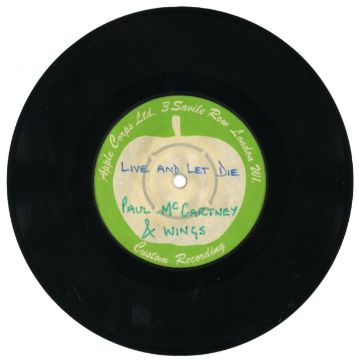 A double sided 7 inch test pressing for ‘Live And Let Die’ c/w ‘I Lie Around’ by Paul McCartney and Wings. The record has an Apple Corps Ltd. Custom recording label with handwritten artist and track details. The matrix number on side one is 7YCE 21722-1, 1G stampers, KT Tax code. The matrix number on side two is 7YCE 21723-1 with the tax stamper KT. The record was released in the UK on 1st June 1973 with the catalogue number R5987.