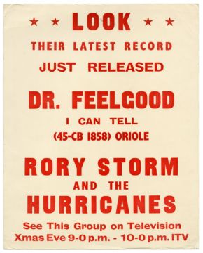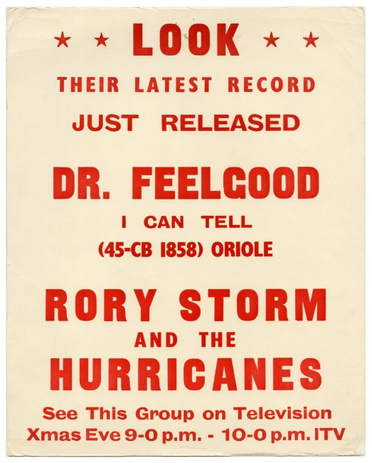 An original 1963 promotional record shop poster for the release of the Rory Storm and The Hurricanes single ‘Dr Feelgood’ c/w ‘I Can Tell’. The single was originally released on Oriole records with the catalogue number 45-CB 1858.
