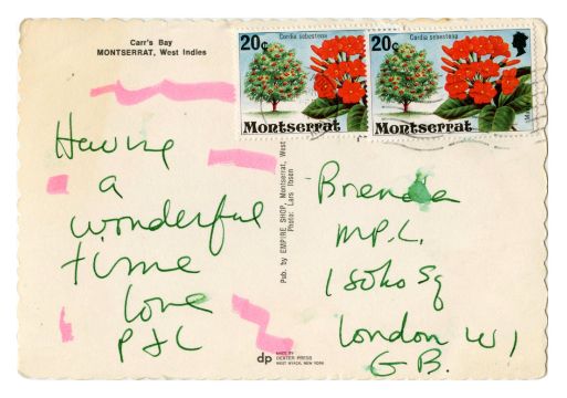An original 1980s postcard handwritten by Linda McCartney in green pen. Linda has addressed the card to ‘Brenda MPL 1 Soho Square, London W1 GB’ and added the message