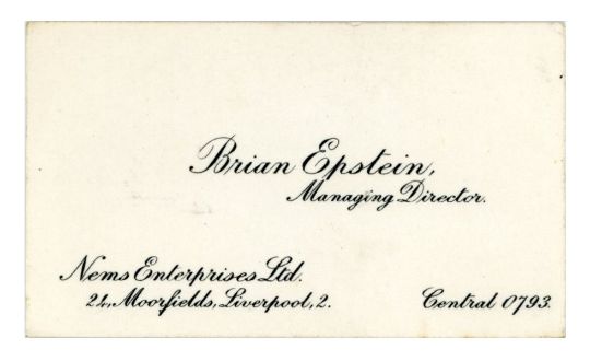A rare vintage 1960s Brian Epstein, NEMS Enterprises business card. The card lists Brian as the Managing Director of the company and lists the 24 Moorfields, Liverpool address.
