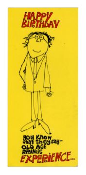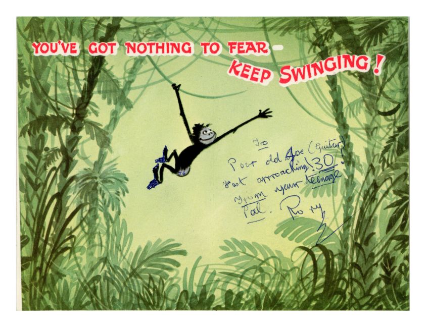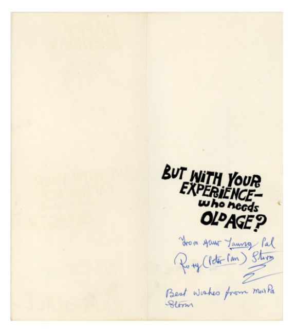 A pair of birthday cards from Rory Storm to Johnny Guitar. Rory has added a handwritten message using blue pen on both cards. The first card reads: ‘To Poor old Joe (Guitar) fast approaching 30! From your teenage pal Rory’. The second has the inscription ‘From your young pal Rory (Peter Pan) Storm’. This card also has a note which reads ‘Best wishes from Ma & Pa Storm’.